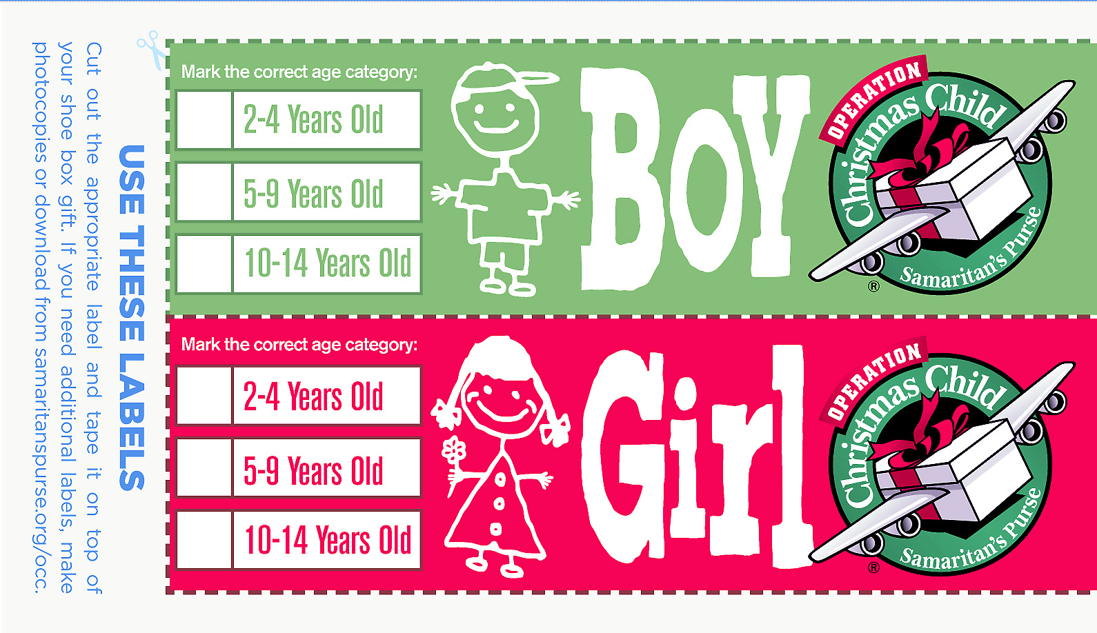 ANNUAL OPERATION CHRISTMAS CHILD: DEADLINE NOV 6 - Blogger Get labels at the church OR print out your own boy/girl label from the Samaritan's Purse website at this link: Operation Christmas Child Labels. Mark the correct age category on the label, and tape the label to the top of your box. 3. FILL WITH GIFTS Fill the box with a variety of gifts that will bring delight to a child.